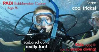 | Voor de kleinste en de jongsten hebben we het BUBBLEMAKER en SEALTEAM programma. Dit kan allemaal al vanaf 8 jaar. Met een duikflesje ademen onderwater, wat een belevenis....vrij als een vis in't water, met leuke spelletjes en opdrachten kennismaken met de onderwater wereld. Bubblemaker programma, in het ondiep gedeelte v/h zwembad spelen onderwater terwijl men bubbeltjes blaast met toffe bezigheden. |