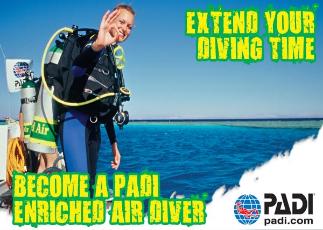 | Duiken met verrijkte lucht Nitrox Duiken met verrijkte lucht nitrox betekent dat je meer tijd onder water hebtDe PADI verrijkte luchtduiker-cursus is PADI’s populairste duikcursus, en het is makkelijk te zien waarom. Als je duikt met verrijkte lucht nitrox krijg je langere nultijden. Dat betekent dat je meer tijd hebt onder water, vooral bij herhalingsduiken. |